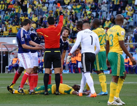 也許失球只是法國隊噩夢的開始,比賽進行到第25分鐘,法國隊攻入南非隊禁區,中場球員、有著“齊達內接班人”之稱的古爾庫夫在爭頂頭球時肘部擊中了對手,南非隊隊員就勢倒地不起做昏厥狀。主裁判果斷出示紅牌,將古爾庫夫罰下。