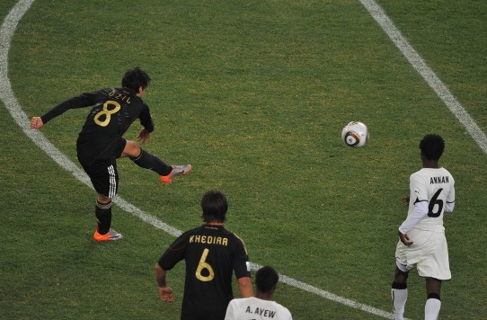 德國隊的控球時間高于對手,但是前鋒的把握機會能力差強人意。16分鐘,波多爾斯基抽射打空。加納隊的控球能力也很強,隊員們技術(shù)比較出色,反擊十分犀利。第25分鐘,德國隊獲得了開場以來最好的機會,厄齊爾拿球后單刀直入,但是面對對方門將金森,竟然將球射到對方身上,皮球被擋出。加納隊隨后也發(fā)動進攻,阿尤角球開到前點,吉安高高躍起頭球攻門,門將撲救不及,但幸好門前的拉姆護門成功,在球門線上用身體將球擋出。