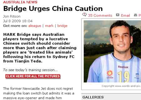 中新網(wǎng)7月9日電 布里奇,一個(gè)天津泰達(dá)隊(duì)球迷都不會(huì)陌生的名字。這位澳大利亞外援曾在本賽季初效力于天津泰達(dá)隊(duì),現(xiàn)在已經(jīng)離開(kāi)中超加盟悉尼FC隊(duì)。日前他在接受澳大利亞《442》雜志采訪時(shí)憤怒的回憶了在中超的悲慘生活。他表示,中超的球員就像畜生一樣被對(duì)待。