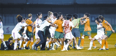 1:2落后,澳大利亞姑娘們似乎眼睛都紅了!兇猛得近乎男足的飛鏟在最后的時刻頻頻上演,無論是中國隊還是澳大利亞隊都在咬著牙堅持著。傷停補時的到來使得這場較量進入白熱化,門將張越的一次受傷倒地成為導火索,澳大利亞隊認為中國隊是在故意拖延時間,兩隊頓起糾紛,雙方替補席上的非比賽人員均沖入場內(nèi),一陣混亂過后,一名中國隊教練和澳大利亞隊后衛(wèi)都被出示黃牌,如此激烈的判罰引起了澳大利亞球員的普遍不滿……