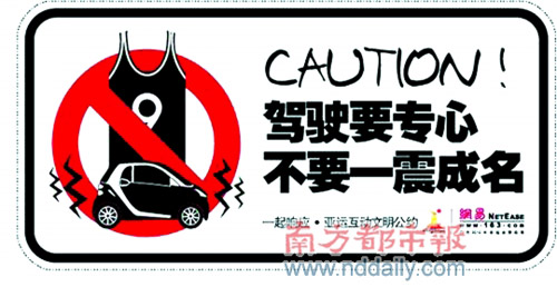 在剛剛結束的車展上,網易為推廣《亞運文明公約》,特推出了一套以“孫悅車震事件”為主題的搞笑車貼向觀眾派發。車貼上寫著:駕駛要專心,不要一震成名。現場不少參觀者看到“孫悅車貼”后,都忍不住咧嘴偷笑。