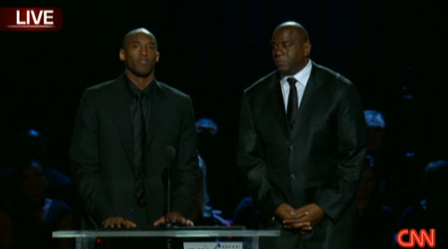 在追思會進(jìn)行到中斷的時(shí)候,約翰遜和科比身著黑西裝緩緩步入講臺。科比在發(fā)表感言時(shí)說,“我們每個(gè)人都應(yīng)該銘記邁克爾·杰克遜的貢獻(xiàn),他活在我們的記憶中.在臺上和臺下的他一樣精彩,他永遠(yuǎn)與我們同在。”