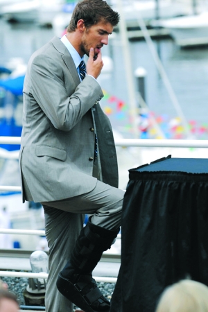 對菲爾普斯來說,戰勝奧尼爾似乎不那么簡單,因為他在之前的車禍中弄傷了右腳,發布會上,他全程都用護具緊緊包裹著傷腳,但是菲爾普斯笑著說:“兵不厭詐,這個護具將會對奧尼爾造成困惑,他一定會迷惑我到底能發揮到幾成,哈哈,我們賽場上見。”
