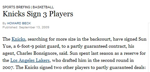 中新網(wǎng)9月14日電 北京時間昨日晚,《紐約時報》曝料稱:孫悅的經(jīng)紀人查爾斯·包辛諾透露,尼克斯已經(jīng)同中國球員孫悅簽訂了一份部分保障合同,補強球隊后場。