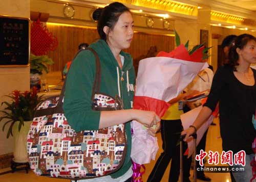 由于飛機晚點,中國女排姑娘抵達我市比原定時間足足晚了1個多小時。當大巴車停穩以后,女排領隊胡進第一個走下車來,向眾人打招呼,緊隨其后的則是身著米黃色T恤衫的主帥王寶泉,隨后15名隊員陸續下車,接受學生們獻上的鮮花。