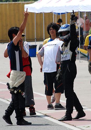 在事故發(fā)生后,韓寒鉆出已經(jīng)面目全非的賽車,用盡全力狠狠地摔了下車門,然后走下賽道。掙扎著駛回賽道的王睿,也在幾圈后遭遇裁判黑旗而退出比賽。當(dāng)王睿將車開會維修區(qū)時,已經(jīng)脫下一半賽服的韓寒,一邊打電話,一邊上前安慰王睿。隨后,兩人非常默契地同時伸出中指,高高地指向天,并各自轉(zhuǎn)了360度,以便讓現(xiàn)場的更多觀眾和記者看到。此舉立刻引起軒然大波。