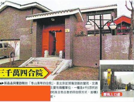 現在,越來越多的跡象都在表明郭晶晶和霍公子的婚期已近。昨天,香港一媒體爆出郭晶晶正準備裝修去年霍家所贈的價值3000萬人民幣的豪華別墅,并稱“這很有可能就是他們倆在北京的婚房!”據說,這套別墅位于北京海淀區四季青鎮門頭村,在五環以外。據記者了解,該樓盤的中式院落獨棟別墅面積為300—550平米之間,另外,每棟別墅送150平米的地下室。該別墅在2007年的預估開盤價就高達55000—60000元/平米。難怪媒體都將這一帶的房子稱作“北京頂級私人豪宅群落。”