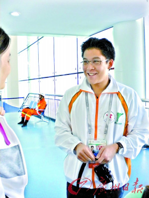 在十一運(yùn)游泳比賽的第一天,賽場(chǎng)內(nèi)的焦點(diǎn)是劉子歌、焦劉洋和張琳這3位世界冠軍。比賽剛開(kāi)始,看臺(tái)上已經(jīng)座無(wú)虛席。記者就坐在香港隊(duì)隊(duì)員旁邊,就在男子 400米自由泳預(yù)賽開(kāi)始時(shí),香港隊(duì)隊(duì)員們紛紛拿出了數(shù)碼相機(jī),記者以為他們是要拍正在比賽的世界冠軍張琳,但只見(jiàn)隊(duì)員們輪流換座位,要求坐到一個(gè)帥氣的男生身邊與之合影。記者上前一看,這個(gè)“明星”胸前的VIP證件上寫(xiě)著“香港代表團(tuán)霍啟剛”。