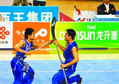 本以為昨天的兩次斷棍事故會給所有參賽隊敲響警鐘,但通過今晚的比賽來看,起碼廣西隊和已經(jīng)出現(xiàn)過一次事故的四川隊并沒有重視比賽器材的選擇和維護。在男子對練比賽中,廣西隊的黃俊華/黃杰第三個出場,他們表演的項目是樸刀進槍,也就是長刀與長槍的對抗。比賽進行到了一半,黃俊華一刀砍向使槍的黃杰,長槍抬起格擋時意外發(fā)生,長槍的木桿與刀刃接觸后立刻斷為兩截,廣西隊本項比賽沒有獲得成績。