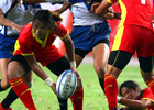 23日,橄欖球男子組決賽中,中國香港隊(藍)以21:28不敵日本隊,獲銀牌。圖為激烈火爆的賽場瞬間。[詳細]