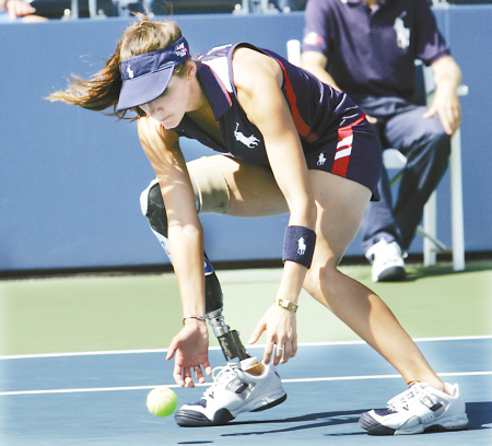 因為在六月的紐約鐵人三項賽殘疾人組中表現(xiàn)出色,她被賽事組織者,也是美網(wǎng)董事會成員霍夫看中,受邀來美網(wǎng)當球童。但這并不是一份“保送通知書”,布魯諾和幾百位健全人一起參加了兩輪“海選”。通過第一輪之后,她和備戰(zhàn)美網(wǎng)的球員一樣開始艱苦訓練,不是雙手反手回球,也不是單手大力抽擊,而是雙手快速撿球、單手準確擲球。當終于登上美網(wǎng)賽場,“那些比我小很多的球童只是好奇,這里怎么會有個‘鋼鐵俠’,他們完全忘記我失去了一條腿”。