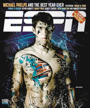 菲爾普斯憑借在北京奧運(yùn)會中的曠世表現(xiàn),接連登上美國《體育畫報》和ESPN雜志封面。ESPN對飛魚圖片進(jìn)行了十分“前衛(wèi)”的處理,赤裸上身的菲爾普斯纏滿花紋,酷似文身,看上去頗有幾分詭異。