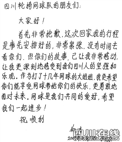 “四川輪椅網球隊的朋友們,大家好……”在輪椅網球隊隊員的簇擁下,教練陳林一個字一個字地讀著鄭潔的回信,偌大的網球場一下就安靜下來。上個月來到災區獻愛心的鄭潔,通過本報記者了解到了四川輪椅網球隊的情況后,這位重情義的川妹子立刻承諾要寫信鼓勵隊員。在奔赴德國比賽前,鄭潔將親筆信和20多張簽名照片快遞給了本報記者,并委托記者一定要親手交到隊員們的手中。