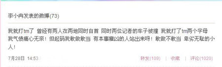 最近福建兩位記者因揭露“紫金礦業”,結果在同一天兩位記者的車子同時被撞。李小冉尤其關注這則新聞,她在昨日中午的微博中發飆:“天災就夠叫人無奈的了,人禍也是沒完沒了。”她還 在微博中爆粗口,引來粉絲圍觀,認為其有損形象。