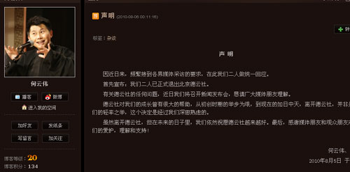中新網(wǎng)8月6日電 今天凌晨,相聲演員何云偉在其個(gè)人博客上發(fā)表聲明,稱已和李菁一起正式退出德云社。在其聲明中,并未提及退出德云社的理由,不過何云偉表示,二人近期將舉行新聞發(fā)布會(huì),向公眾說明情況。