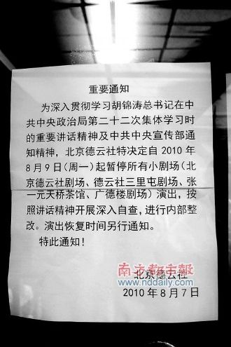7日凌晨,德云社在其官網德云相聲網上發表聲明,表示從9日起將停止所有小劇場演出,“北京德云社特決定自2010年8月9日(周一)起暫停所有小劇場的常規演出,進行內部整改。具體的演出恢復時間,將根據實際情況另行通知。特此通告。”聲明傳出,南都記者第一時間和德云社副總經理王海取得了聯系,電話中,王海拒絕對此事發表任何評論,只是表示“演出近期內都不會恢復”。