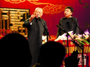 當郭德綱和于謙上場時,觀眾更是送上大型玩具熊,讓郭德綱樂開了花。由于昨晚來到現場的大部分是“資深鋼絲”,因此演員們的唱段觀眾幾乎都能跟著唱,郭德綱見此情景恍惚間兩眼含淚。而他的表演也在“回應”現實。