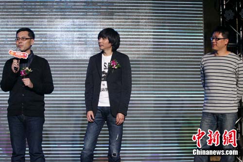 張亞東(中),臺灣著名音樂制作人江建民(右)以及臺灣著名音樂人、作詞人、電臺主持人何厚華(左)出席20日“快樂,改變,生活——群星歡聚演唱會”的新聞發布會。