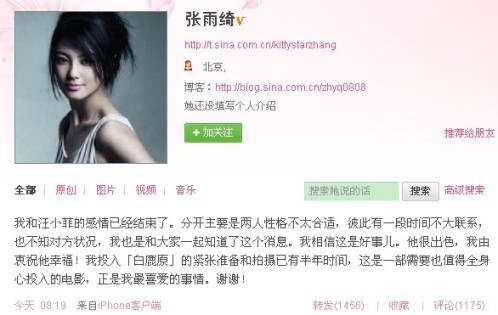 張雨綺在微博中表示:“我和汪小菲的感情已經結束了。分開主要是兩人性格不太合適,彼此有一段時間不大聯系,也不知對方狀況,我也是和大家一起知道了這個消息。我相信這是好事兒。他很出色,我由衷祝他幸福!我投入《白鹿原》的緊張準備和拍攝已有半年時間,這是一部需要也值得全身心投入的電影,正是我最喜愛的事情。謝謝!”