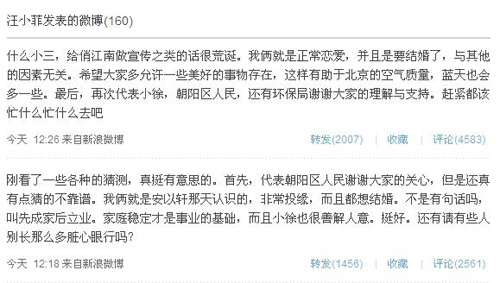 此后汪又再次追發微博,表示“什么小三,給飯店做宣傳之類的話很荒誕。我倆就是正常戀愛,并且是要結婚了,與其他的因素無關。希望大家多允許一些美好的事物存在,這樣有助于北京的空氣質量,藍天也會多一些。最后,再次代表小徐,朝陽區人民,還有環保局謝謝大家的理解與支持。趕緊都該忙什么忙什么去吧。”