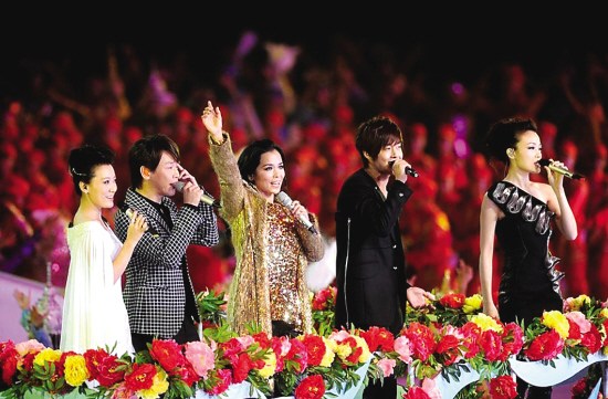 此次亮相開幕式,韋唯和譚晶、陶喆、金賢重、容祖兒等五人共同演唱《日出東方》。已是前輩的韋唯梳著時髦的發型,毫不顯老。