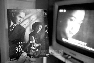 記者看到盜版《色,戒》的封面上是大家熟悉的電影海報,上面同樣印著“色易守,情難防”的宣傳語,內頁有電影的劇情介紹。帶回辦公室一放才發現其中有“貓膩”,原來這個電影版的《色,戒》雖然畫面比普通的“槍碟(手持攝影機拍攝的盜版)”好,而且幾乎沒有晃動的人影和嘈雜的環境聲音,但根本不是所謂的完整版,7分多鐘的激情戲并沒有出現。
