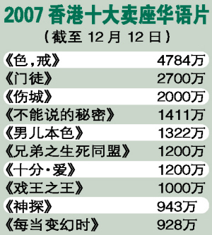 臨近年底,電影界又到了總結(jié)之時(shí)。前日,香港影業(yè)協(xié)會(huì)公布了今年香港電影的票房情況:因?yàn)榻?jīng)濟(jì)回升,香港電影也隨之升溫,全年票房有望超過(guò)10億港元,而僅《色,戒》一片就以近5000萬(wàn)的票房,撐起了華語(yǔ)片的半邊天。