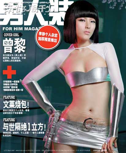 看著這個美人從古典端莊飛躍到裸露性感,從此,我們都知道應該脫了,就是不知道怎么才能既脫成那樣,又保護了自己。把自己扒光了給人看也是需要勇氣的,盡管曾黎說是《男人裝》PS掉了她穿的內褲,可不能否認,這一脫將她的端莊形象一掃而空。感謝《男人裝》,在電影分級制度看不到曙光的前提下,率先用雜志演繹出了性感靜像電影,唯一的遺憾是,如果雜志做成3D立體效果就好了。
