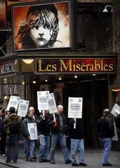 中新網(wǎng)11月11日電 綜合報(bào)道,美國娛樂界罷工潮升級美國好萊塢影視編劇罷工風(fēng)波還未解決,美國紐約百老匯舞臺(tái)人員10日采取罷工,20多出話劇和音樂劇因而被迫停演,觀眾須退票。在時(shí)代廣場上可以看到許多失意的百老匯舞臺(tái)員工,而由于資方態(tài)度強(qiáng)硬,目前新一輪談判是否能夠舉行仍是未知數(shù)。