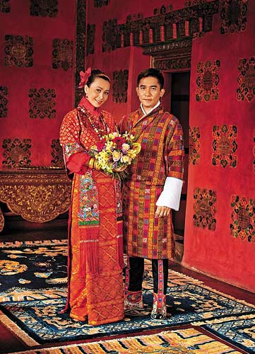 中新網(wǎng)7月21日電 梁朝偉和劉嘉玲今日在佛國不丹舉行婚禮,前日一對準(zhǔn)新人則在不丹王宮穿上當(dāng)?shù)氐膫鹘y(tǒng)國服拍攝結(jié)婚照。
