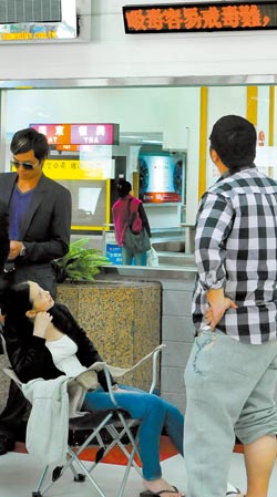 蕭淑慎(坐者)呆望著跑馬燈的字“吸毒容易戒毒難”,或許心有戚戚焉。