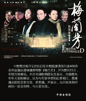 《梅蘭芳》上映首周末就在全國取得了4218萬元的票房。中影集團(tuán)新聞發(fā)言人翁立稱,這是一個(gè)讓“各方都滿意”的成績,他透露影片1.2億的票房是發(fā)行方的底線。