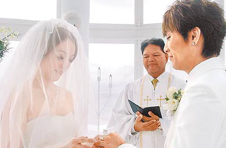 教堂內氣氛歡樂、歌舞升平,外頭雨勢卻下不停,記者目擊教堂找來外籍牧師,才講了幾句,新人鼻頭已酸,搭配外頭狂風暴雨,老天爺跟新郎、新娘一起掉眼淚,約莫1小時后禮成奏樂,天空頓時放晴,不知是好兆頭,還是烏云罩頂。
