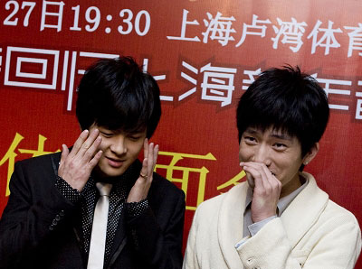 僅發(fā)行了一張EP和一張專輯便來上海舉辦演唱會,除了人氣,BOBO組合的勇氣也令人佩服。昨日下午,兩位成員在滬上舉行記者會,宣布將于本月27日在上海盧灣體育館舉行首場個唱。目前成員井柏然正在拍攝電視劇《向周星馳致敬先》,對于日前曝光的山寨版“至尊寶”形象,井柏然信心十足地說:“我比周星馳帥!”