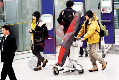 兩人情侶打扮,還帶著裝滑雪板的長袋子,裝備專業?磥,喜歡北海道的不僅僅是梁朝偉和劉嘉玲。