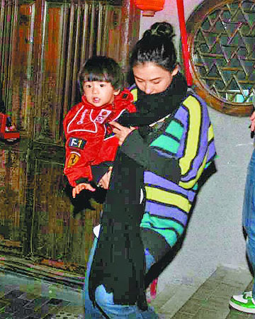體態飄孕味的張柏芝前晚抱兒子Lucas小心翼翼下樓梯。