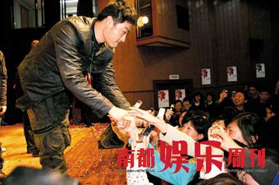 黃維德在舞臺上盡顯偶像風(fēng)采,中途更深入到群眾中去,和大學(xué)生握手互動,做男人難,做“小三男”其實不難。
