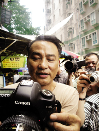 昨天的拍攝地點叫永利街。那是很窄的一條街道,其中一邊已經改造成了高樓,另一邊則保留了一些舊樓。劇組在舊樓這邊搭了些鐵架和舊式廣告招牌,營造上世紀60年代的氣氛。導演羅啟銳介紹:“這條街是香港最后一條60年代老街了,本來已經要拆掉,但是政府為了關照我們,特意推遲到我們拍完再拆。我們用這條街來重現當年的深水埗!备邩谴髲B的存在有時挺影響拍攝,“經常穿幫,要靠后期特效來消除”。據說,導演小時候就住在這里。