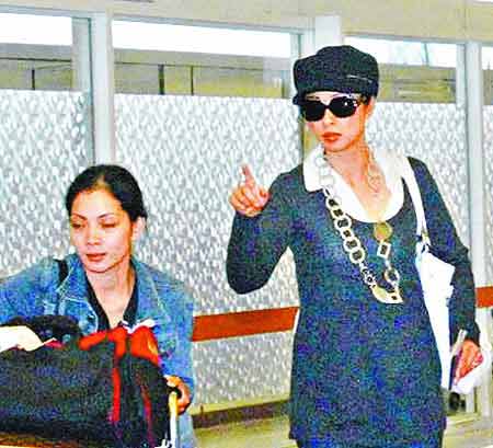 葉倩文(右)前天來臺,在機場指揮助理搬運行李。