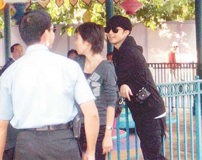 手抱一名女孩的基仔,被不少游客認出,紛紛上前要求合照,他興致很好,來者不拒。因基仔被人群包圍,更引得保安上前為他護駕,基仔又拿著相機為女孩拍照。