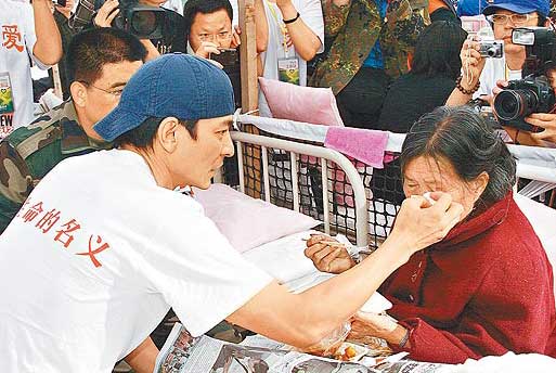 在寺院逗留個半小時后,他們又到重災區綿竹一間工廠探訪,工廠負責人帶眾星參觀,工人看見華仔、陳道明和葛優等紅星顯得很開心。為工人打氣后,他們又到臨時安置區和臨時醫院探訪,醫護人員和病人看見華仔等人歡喜若狂,其中華仔在醫院跟一名75歲老婆婆聊天,老婆婆已接近盲,不知道探望她的是位紅星。老婆婆在地震時受傷致骨折,她向華仔哭訴,孫女在地震中死亡,華仔見到她如此傷心,也不禁流下男兒淚,但仍不斷安慰婆婆和為她拭淚,還承諾會照顧她。