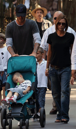 中新網6月13日電 據英國《每日郵報》報道,美國當地時間星期三下午,貝克漢姆和維多利亞帶著三個兒子,大游迪士尼樂園。現場所見,他們的大兒子布魯克林與二兒子羅密歐已漸有明星架勢,小兒子克魯茲則獨享寶寶車,睡得十分香甜。