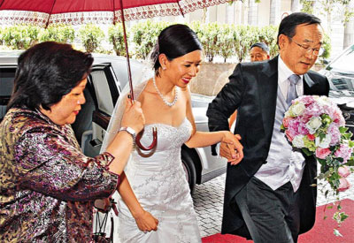 中新網8月13日電 現年41歲的羅慧娟(娟妹)昨日與57歲新加坡籍金融才俊劉志敏結束10年愛情長跑,手牽手步入教堂成婚。新郎宣誓時既緊張又感動,冒汗又流淚,新娘子貼心為他拭抹之余,也忍不住流下熱淚,場面感動。一直有順其自然造人計劃的娟妹,昨日穿上貼身婚紗時腹部微隆,不禁令人猜想她雙喜臨門。