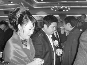 前日10時28分,趙本山的女兒趙玉芳及女婿汪洋在酒店6樓的宴會廳舉行婚禮,現場布滿紫色花朵,盡顯典雅。而在婚禮正式開始前的一個多小時里,趙本山的眾位弟子紛紛登場,在酒店門外表演了嗩吶演奏和小品等節目助興。