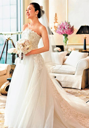 昨日黎姿透過(guò)無(wú)線發(fā)了兩款婚照,分別是一襲婚紗和一襲粉紅晚裝,雖未見(jiàn)丈夫馬廷強(qiáng)在旁,但黎姿笑容甜絲絲。據(jù)知這輯相是黎姿和丈夫設(shè)宴前一天提早入住酒店補(bǔ)拍的,由著名攝影師張文華操刀。