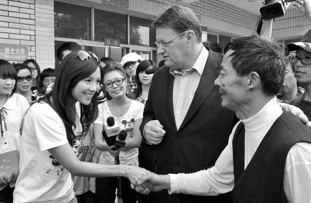 在探望中,一位大爺來到章子怡身邊。院長吳德玉向章子怡介紹,這是福利院的門衛大爺。在去年5·12地震發生時,為了救被困在院里的孩子,大爺不顧危險翻墻進去,不慎摔傷了自己的雙腿。章子怡很感動,她突然伸出右手高呼:“向抗震英雄學習!”并佩服地對大爺說:“你是英雄,你是超人!”