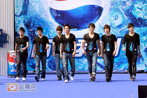 新加盟成員SJ-M先聲奪人,如古代騎士般在塔樓尖上出現(xiàn)的他們立刻引起了在場(chǎng)歌迷的陣陣尖叫。而后古天樂(lè)、蔡依林、李準(zhǔn)基、羅志祥、黃曉明在印有該品牌標(biāo)識(shí)的大卡車頂緩緩出現(xiàn),12位成員當(dāng)場(chǎng)在臺(tái)上互相潑水取樂(lè),宛如畫面。