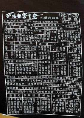 記者從這份泄密的拍攝通知單上發(fā)現(xiàn):今天拍攝的將主要是張三(孫紅雷)和李四(小沈陽(yáng))之間的對(duì)手戲,其余人物還有王五、趙六以及陳七、老板娘、巡邏隊(duì)、波斯商、人胭脂、店伙計(jì)。拍攝道具則包括旱煙、馬車、火鐮、搭囊、火筒彈藥、弓箭、腰刀等,另有駱駝以及馬12匹。看來(lái)今天拍攝的大部分都是外景。有意思的是,這張拍攝通知單上還有一條“特殊道具提示”:油潑辣子、烙鍋盔用發(fā)面,扯面用軟面。而午餐現(xiàn)場(chǎng)是145份,說明這個(gè)劇組規(guī)模還是不小。細(xì)心的工作人員還注明:“住地病號(hào)一人:小米棗粥搓魚面片。”看來(lái)之前所傳劇組伙食不錯(cuò)的消息果然不假。