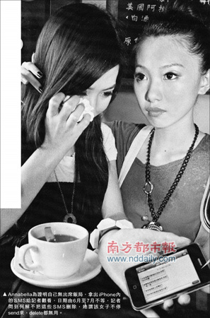 據香港周刊報道,有目擊者稱見到22歲的口靚模A nnabella(羅靖希)和好姐妹A sa(關紫藍)進入灣仔某酒店,疑似陪客吃飯。當港媒向A nnabella求證此事時,她激動否認傳聞稱自己沒有去過“不三不四”的飯局。A nnabella表示的確收到過淫媒的短信,但未答應“我們敢發誓沒有做過(飯局陪客),也沒有給他們電話”,淫媒因此還發信息罵她:“不要再純情扮潔身自愛了!”為證明清白,她還公開淫媒發來的短信,內容包括“今晚灣仔道N ight Club有客6000快覆”、“請覆機去不去,加到一萬上房”等等。