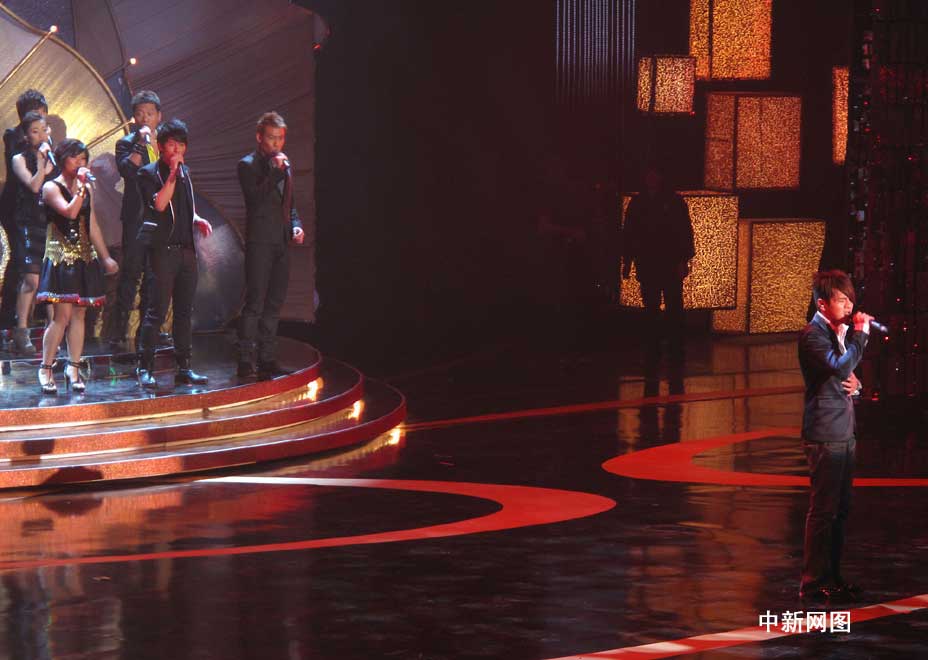 圖為臺(tái)灣人氣歌手曹格率領(lǐng)香港歌唱選秀節(jié)目《超級(jí)巨星》的參賽者表演歌曲聯(lián)唱,為港姐決賽助興。(攝影:余瑞東)